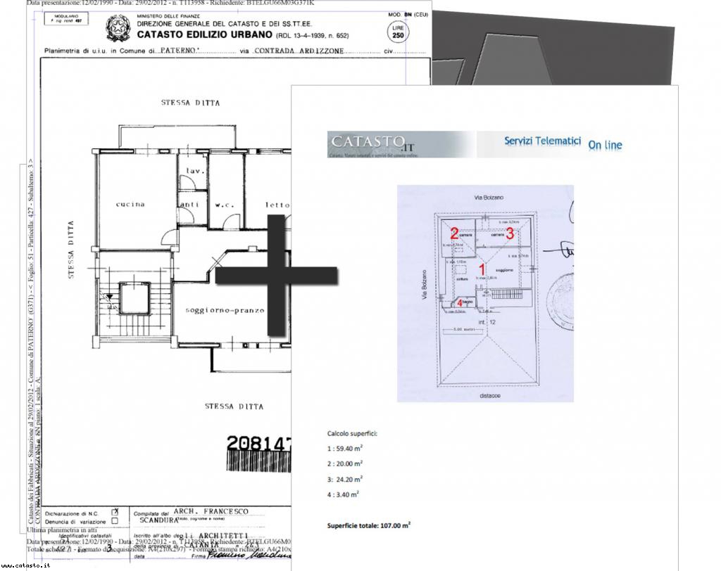 catasto, ed un documento in carta intestata Catasto.it, attestante la superficie utile e
