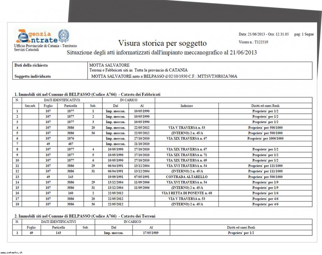 Visura catastale storica per soggetto fisico o giuridico,